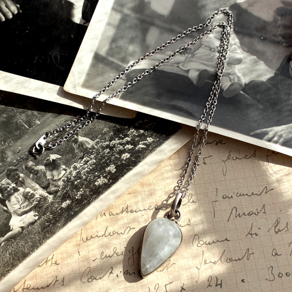 〈925刻印〉ティアドロップムーンストーン|月光を宿すスターリングシルバーアンティークネックレス