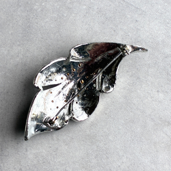 このヴィンテージブローチは、リーフ葉のグレースフルなカーブとシャープなエッジが美しく調和したデザインが特徴です。