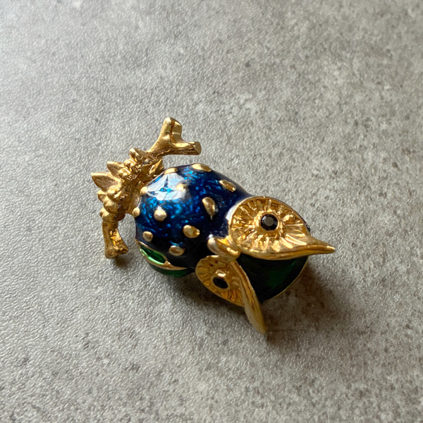 ブルーとグリーンのエナメルで彩られた羽は、深い森の記憶をたたえて。