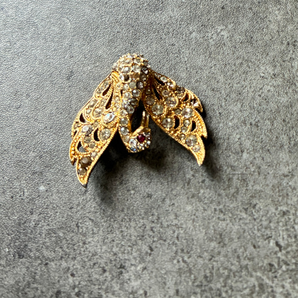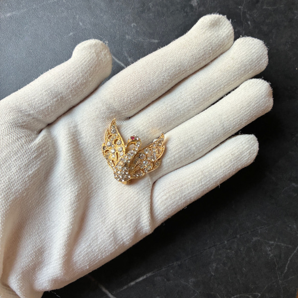 優雅なカーブを描く首筋、繊細に開かれた羽根には、澄んだ光を宿すクリスタルが一粒ずつ丁寧にあしらわれています。
