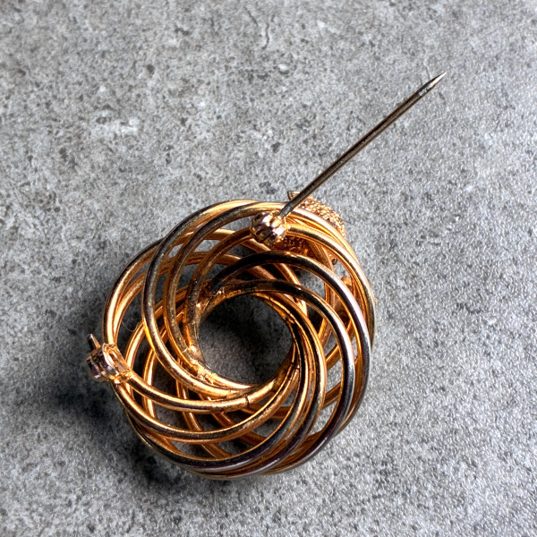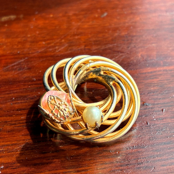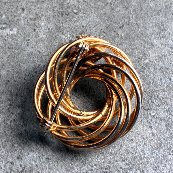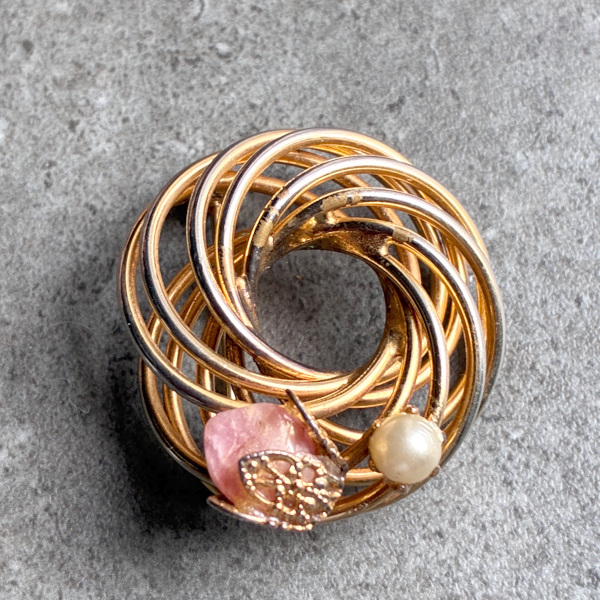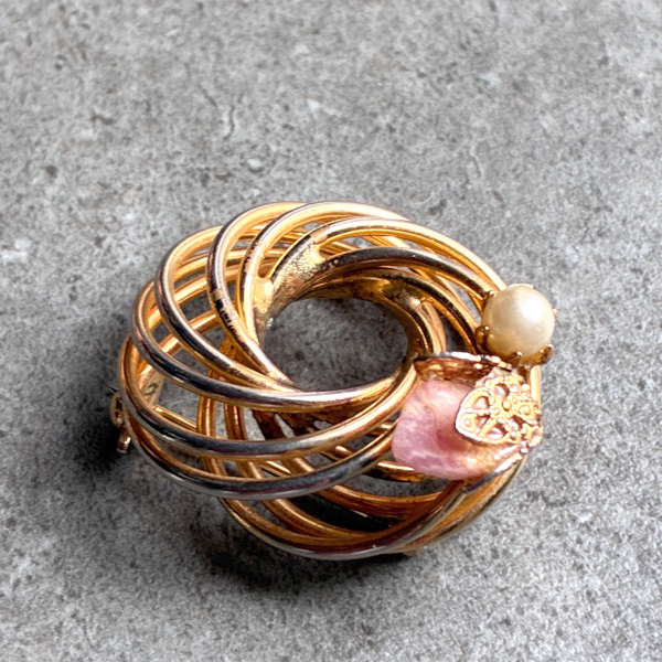 アメリカ 1960年代 ローズクォーツ天然石とフェイクパールのループブローチ [NU1648]