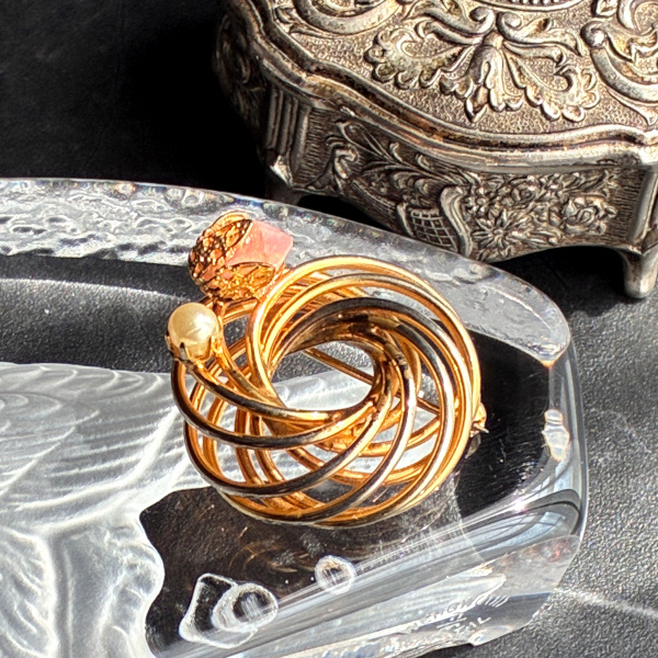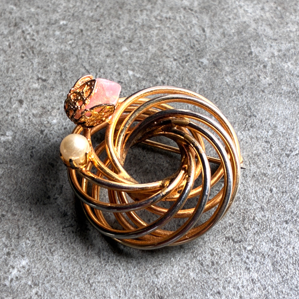 アメリカ 1960年代 ローズクォーツ天然石とフェイクパールのループブローチ