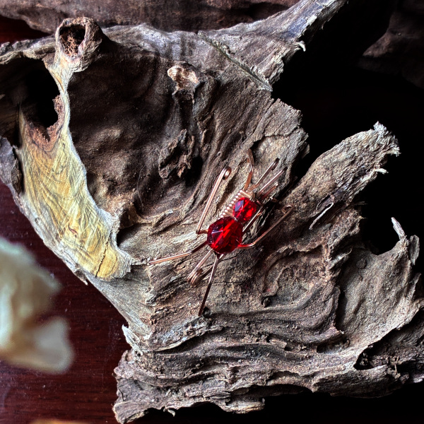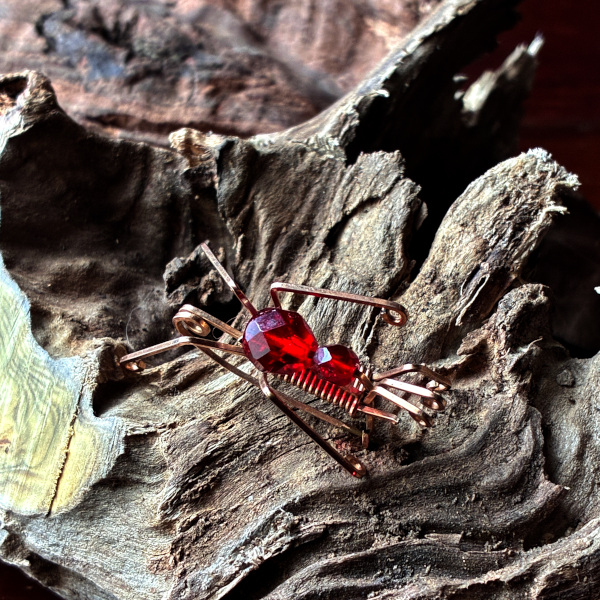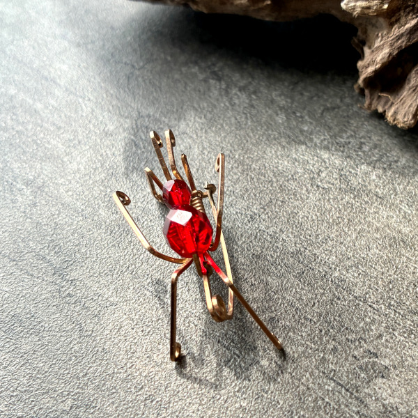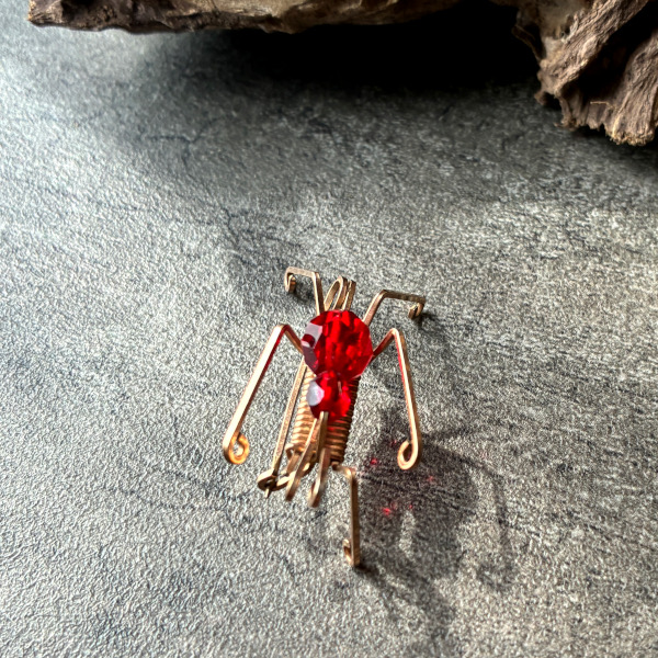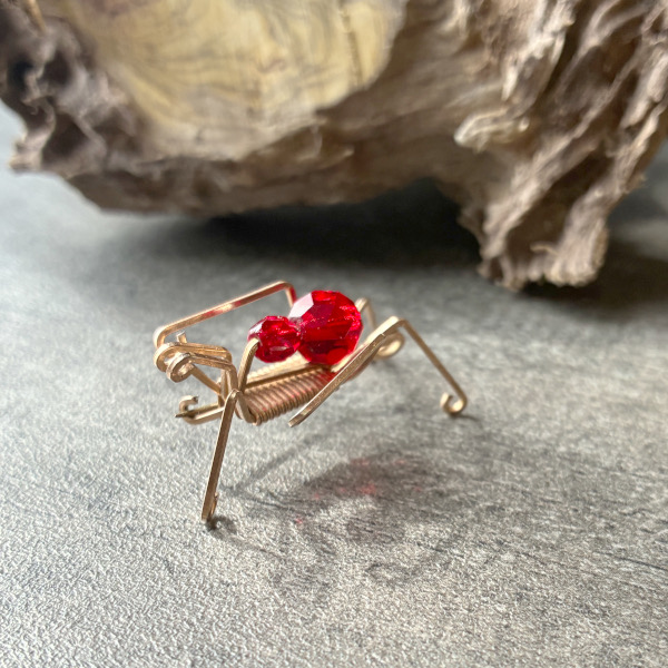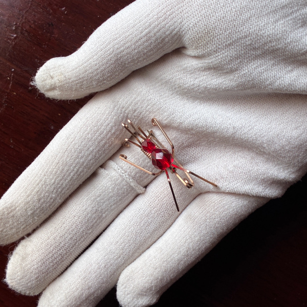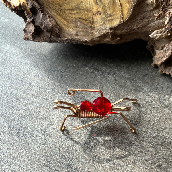 鮮やかな赤いガラスビーズを体に宿した、英国ヴィンテージのバッタブローチ。