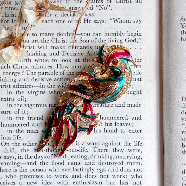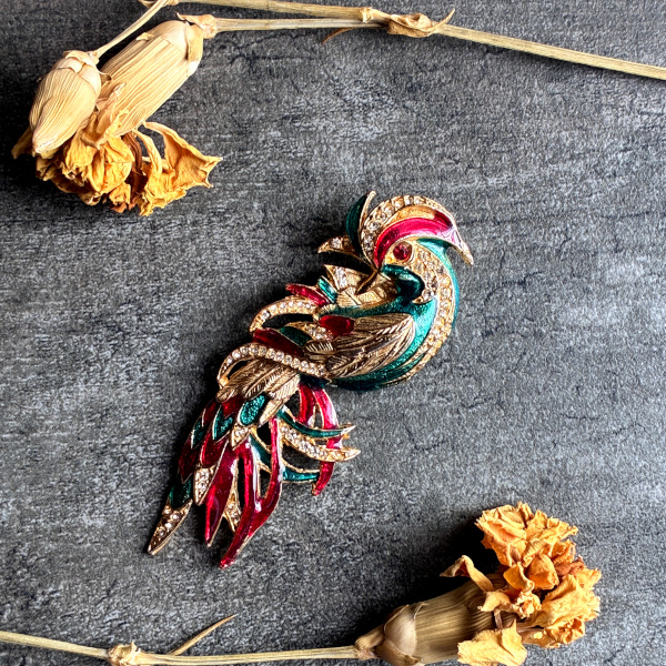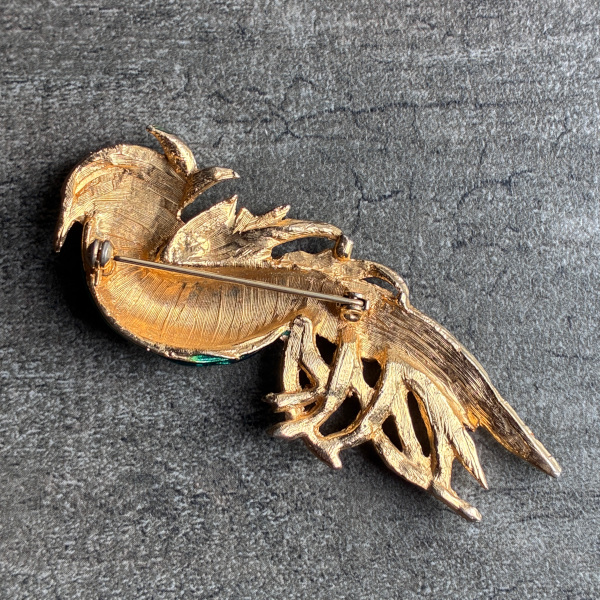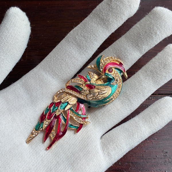 ゴールドトーンに艶やかな緑と赤のエナメル彩色、そして煌めくラインストーンが羽ばたく瞬間を思わせます。