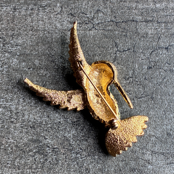 英国ヴィンテージのブローチは、ゴールドトーンの気品をベースに、体は瑞々しい緑、翼と尾は深いブルーのエナメル彩色で彩られています。