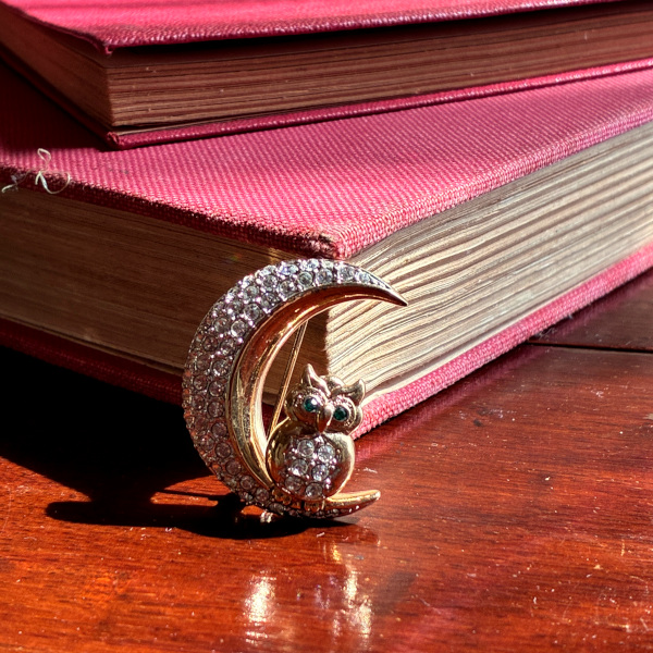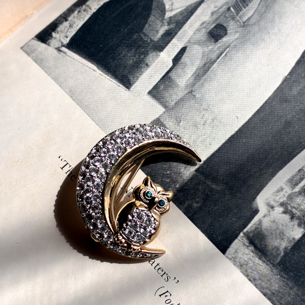 - > 英国ヴィンテージブローチ|刻印BJ フクロウと月のクリスタルブローチ 知恵と幸福を運ぶ守護の鳥