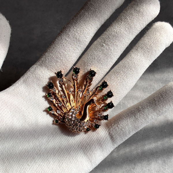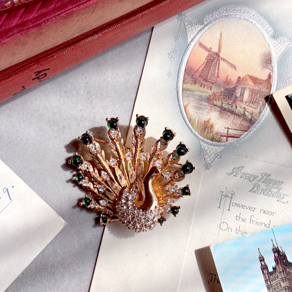 - > 英国ヴィンテージブローチ|孔雀 羽を広げた姿が美しい ヘアラインテクスチャー グリーンガラスとラインストーン