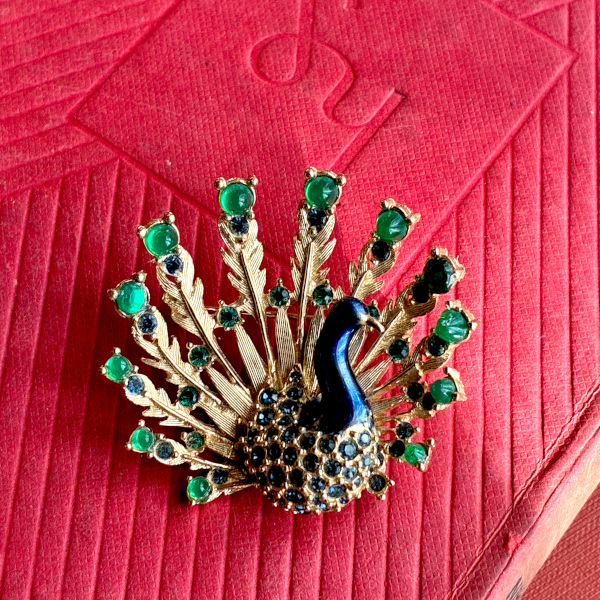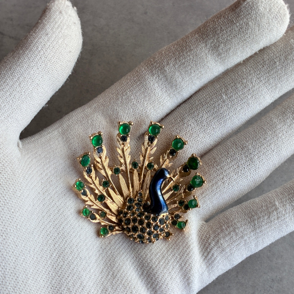 英国ヴィンテージならではの存在感を湛えた、孔雀モチーフのブローチ。