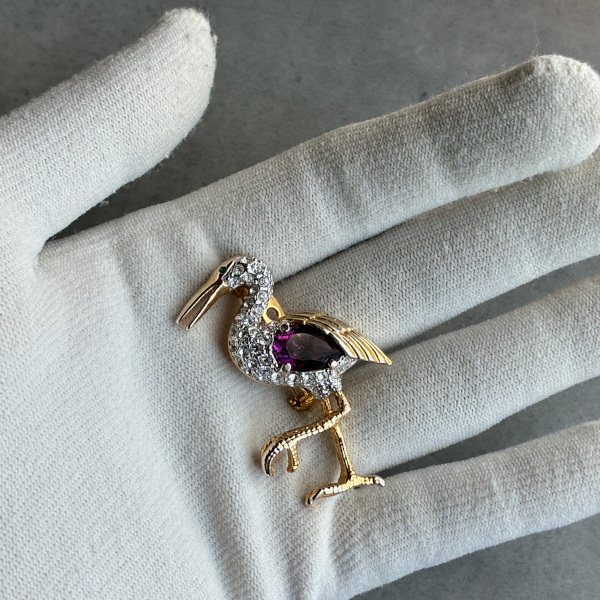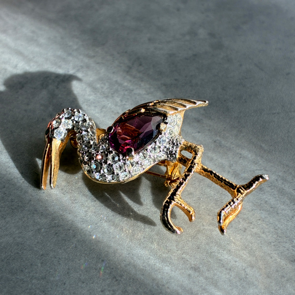 英国ヴィンテージブローチ|静かな湖に佇むサギの、月光をまとった宝石ブローチ [EW0776]