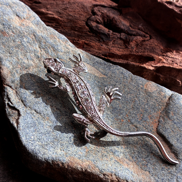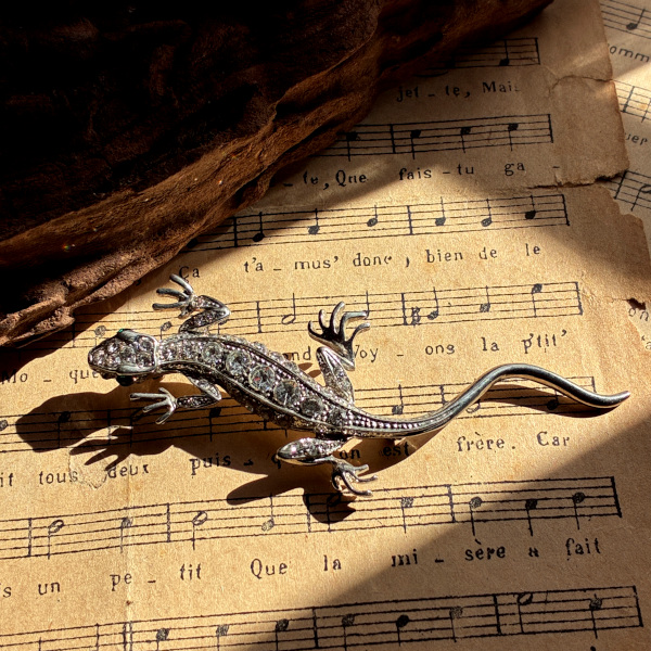 銀の光を纏い、小さな守り神のように胸元へ寄り添うトカゲのブローチ。
