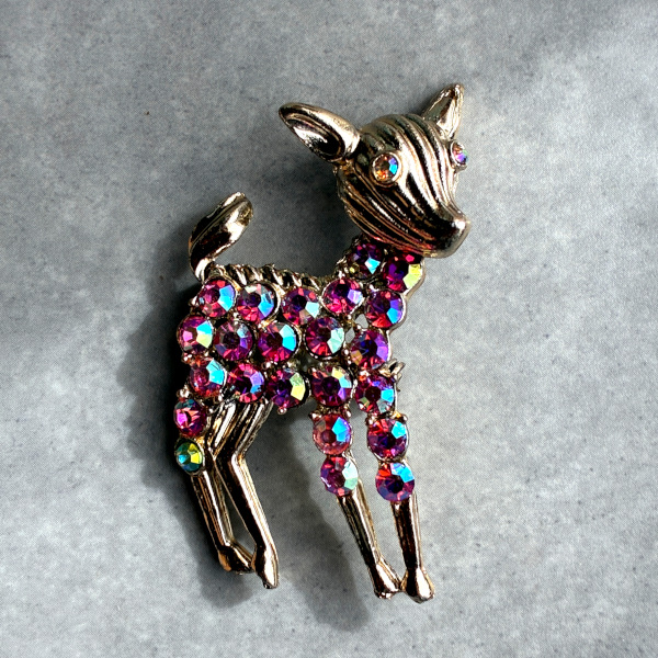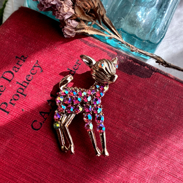 ピンクのオーロララインストーンが揺らめく、英国ヴィンテージの仔鹿ブローチです。